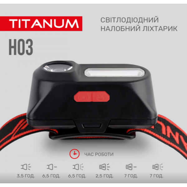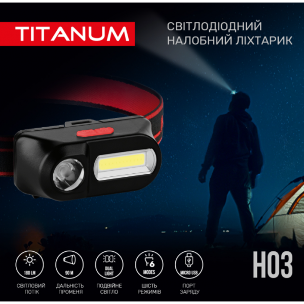 Налобний світлодіодний ліхтарик TITANUM TLF-H03 180Лм 6500K має компактні розміри та зручний і м’який за структурою налобний ремінь, який забезпечує комфорт під час тривалого носіння. Ліхтарик має найбільшу популярність у застосуванні серед туристів, велосипедистів, риболовів та мисливців. Чудово підійде для застосування в майстерні чи гаражі, коли потрібно підсвітити певні зони в процесі виконання робіт і руки при цьому повинні бути вільні. Ліхтарик має механізм нахилу, який дозволяє регулювати кут освітлення. Ще однією особливістю даної моделі є наявність в неї двох джерел основного та додаткового світла. Для зручності керування ними на корпусі ліхтарика розташовано дві кнопки. Також в комплекті до ліхтарику йде акумулятор.