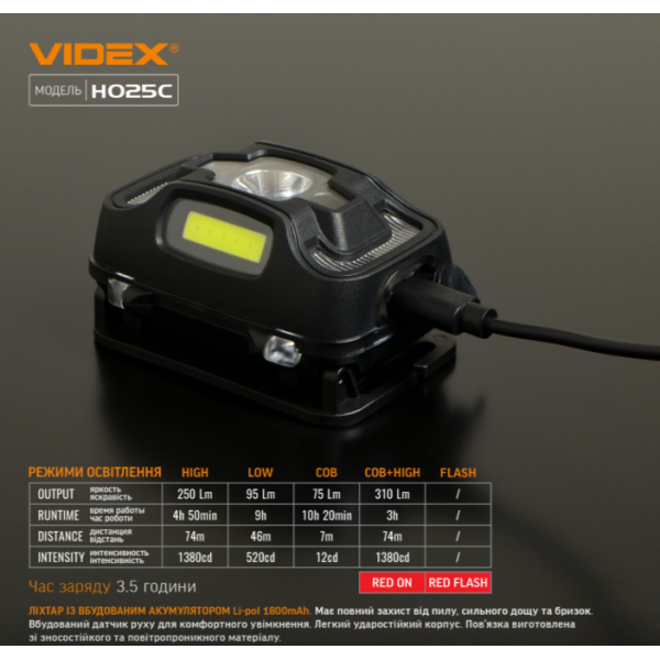 Налобний світлодіодний ліхтарик H025C VIDEX 310Lm 5000K призначений для індивідуального використання в темний час доби або в приміщеннях без освітлення. Основними показниками є герметичність, надійний корпус, дальність світла. Дозволяє обрати необхідний режим роботи. Максимальна яскравість 310Lm. Регульований кут нахилу кріплення дозволяє обрати зручний кут освітлення. Вбудований датчик руху для комфортного увімкнення.
