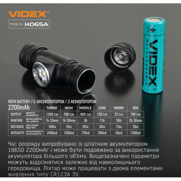 Налобний світлодіодний ліхтарик VLF-H065A 1200Lm 5000K призначений для індивідуального використання у темний час доби або у приміщеннях без освітлення. Розроблений спеціально для активного відпочинку та занять такими видами спорту як біг, трейловий біг, походи, велоспорт. Дозволяє вибрати потрібний режим роботи. Максимальна яскравість – 1200Lm. Замість рефлектора використовується оптична лінза, яка створює бічне засвітлення та центральний промінь далекого світла, що дуже важливо при швидкому русі.