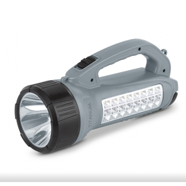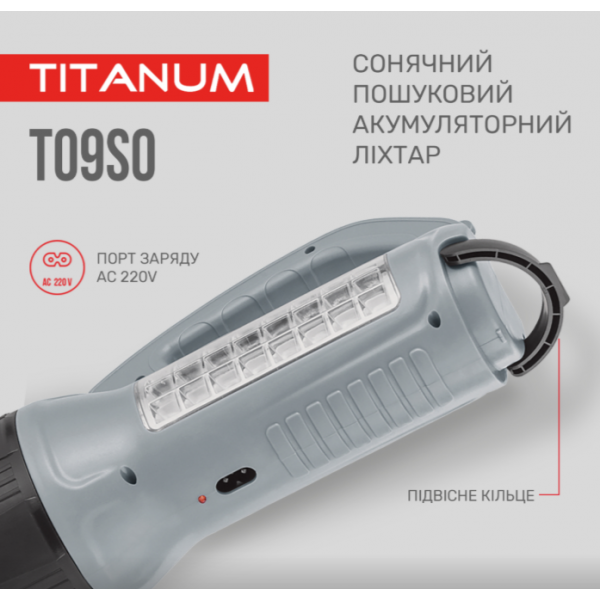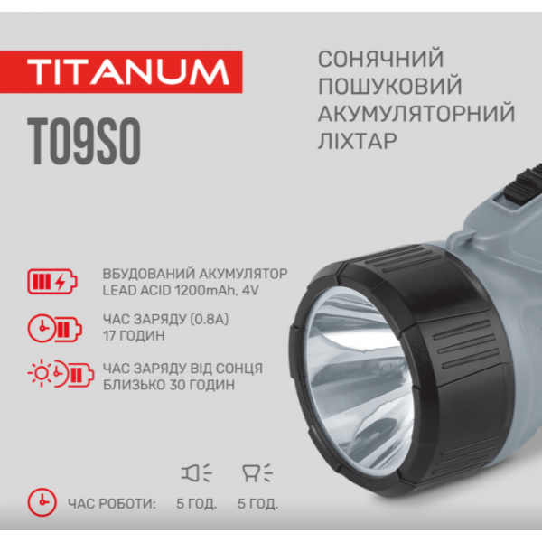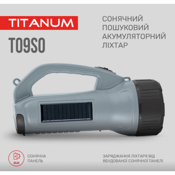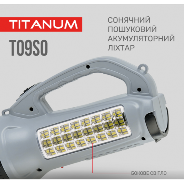 Сонячний пошуковий ліхтар з акумулятором «Titanum» призначений для використання у темну пору доби або в приміщеннях без освітлення. Має зручну ергономічну ручку для переносу, вбудовану сонячну панель та працює від акумулятора. Особливістю даної моделі є два джерела світла: переднє (основне) та бокове, яке використовують переважно для ближнього освітлення. Підходить для застосування у побуті, риболовлі чи туризмі.