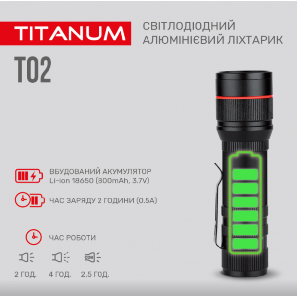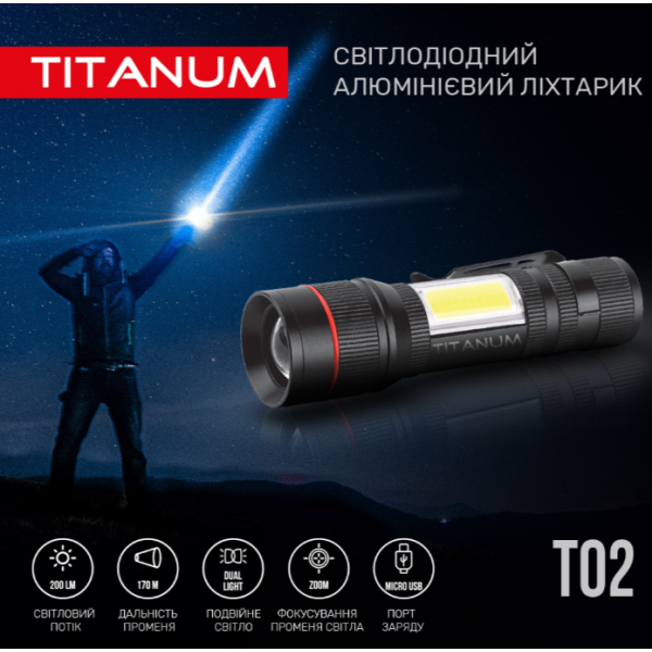 Портативний світлодіодний ліхтарик TITANUM TLF-T02 200Лм 6500K має компактні розміри та не займає багато місця, легко поміститься в рюкзак чи навіть в жіночу сумочку. Підходить для застосування у побуті, гаражі, риболовлі чи туризмі, зокрема для освітлення предметів, об'єктів чи зон, як в приміщеннях, так і на вулиці. Особливістю даної моделі є можливість зміни фокусу променю світла та магнітне кільце на задній частині корпусу ліхтаря, що значно розширює умови використання.