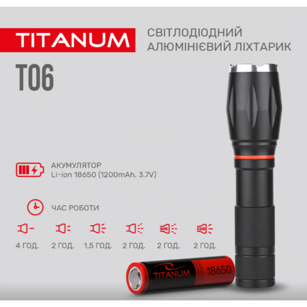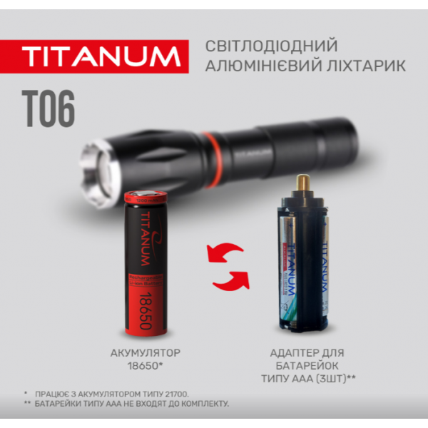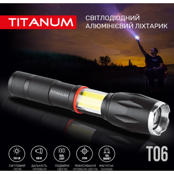 Портативний світлодіодний ліхтарик TITANUM TLF-T06 300Лм 6500K має зручну ергономічну форму, сучасний дизайн та велику дальність освітлення. Підходить для застосування у побуті, гаражі, риболовлі чи туризмі. Особливістю даної моделі є можливість регулювання фокусу променю світла, бокове СОВ світло та магнітне кільце на задній частині корпусу ліхтаря, що дозволяє закріпити ліхтар на металевій поверхні. Дана модель підтримує самостійну заміну акумулятора при необхідності. Може працювати з акумуляторами типу 18650, 21700, а також з батарейками ААА за допомогою адаптера, в який вони розміщуються. Акумулятор йде в комплекті.