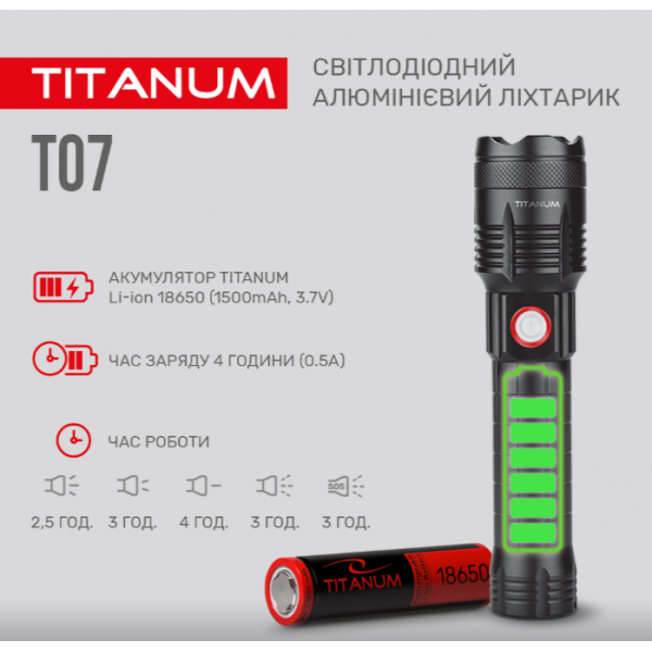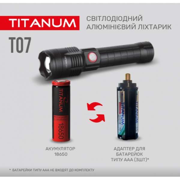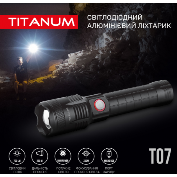 Портативний світлодіодний ліхтарик TITANUM TLF-T07 700Лм 6500K має зручну ергономічну форму, сучасний дизайн та велику дальність освітлення. Підходить для застосування у побуті, гаражі, риболовлі чи туризмі. Особливістю даної моделі є можливість регулювання фокусу променя світла. Дана модель підтримує самостійну заміну акумулятора при необхідності. Може працювати з акумуляторами типу 18650, 21700, а також з батарейками ААА за допомогою адаптера, в який вони розміщуються. Акумулятор йде в комплекті.