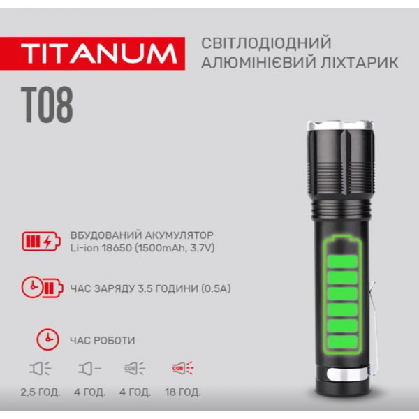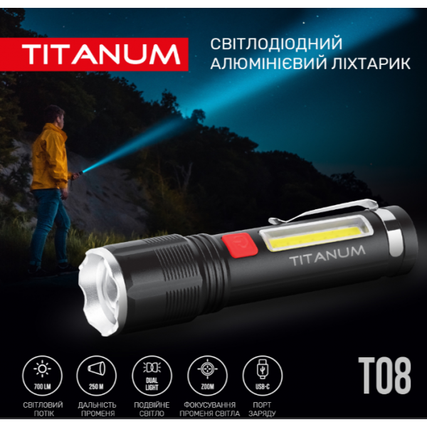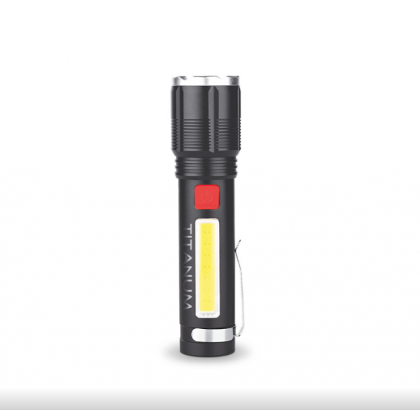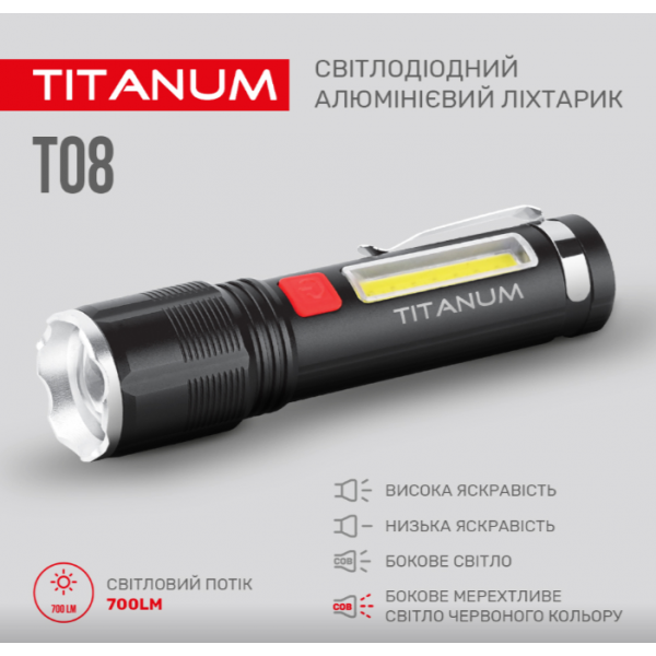 Портативний світлодіодний ліхтарик TITANUM TLF-T08 700Лм 6500K має зручну ергономічну форму, сучасний дизайн та високий показник світлового потоку. Комплектується кліпсою за допомогою якої ліхтарик можна носити на рюкзаку, ремені, бейсболці та інших місцях, де це можливо. Підходить для застосування у побуті, гаражі, риболовлі чи туризмі, зокрема для освітлення предметів, об’єктів чи зон, як в приміщеннях, так і на вулиці. Особливістю даної моделі є можливість зміни фокусу променя світла та бокове «СОВ» світло, яке має червоне та біле світло, що відрізняє цю модель від аналогів. Має вбудований акумулятор.