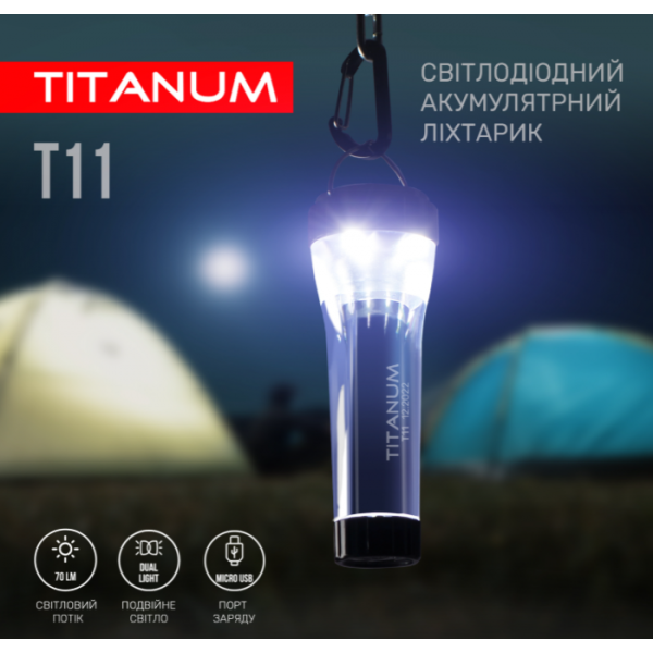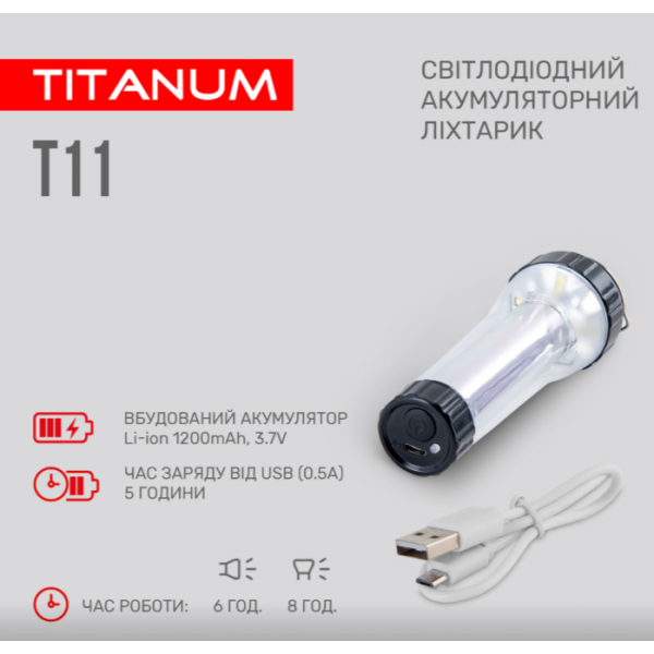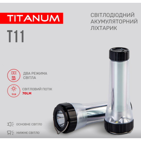 Портативний світлодіодний ліхтарик TITANUM TLF-T11 з акумулятором призначений для використання у темну пору доби або в приміщеннях без освітлення. Має компактні розміри, зручну ергономічну форму та працює від акумулятора. Особливістю даної моделі є два джерела світла: переднє (основне) та нижнє, яке використовують переважно для ближнього освітлення. Підходить для застосування у побуті, має полу кільце на корпусі завдяки якому дуже зручно використовувати в підвісному стані.