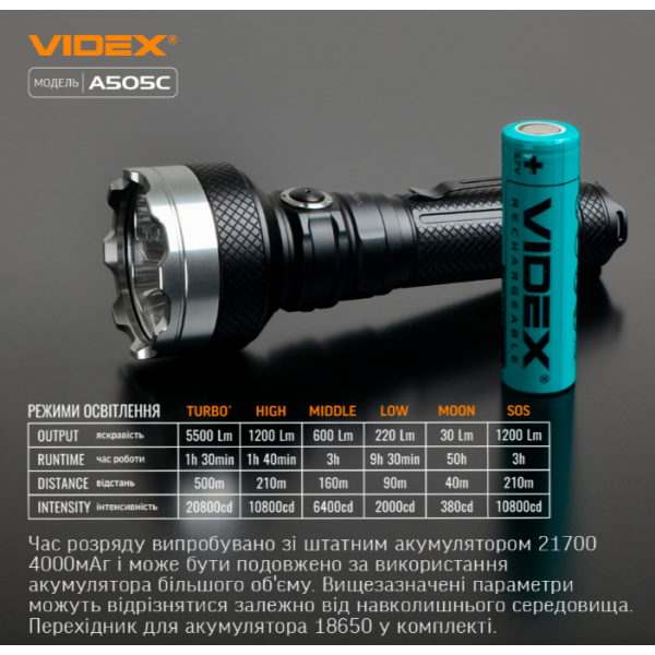 - Швидкий заряд - 2.5 години зі штатним акумулятором Videx 21700 4000мAг.