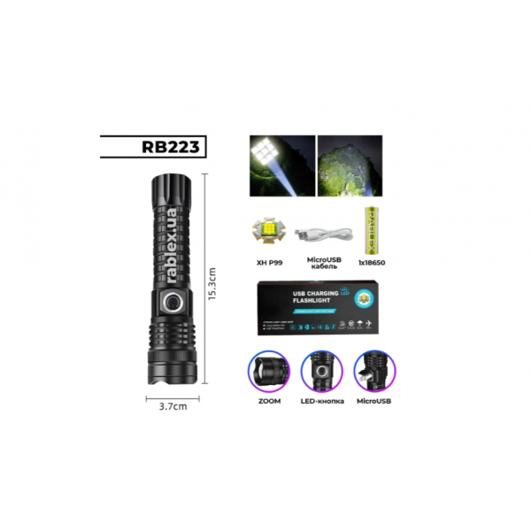 Ручний ліхтар Rablex RB223 поєднує в собі компактні розміри та видатну потужність. Оснащений вбудованим акумулятором 18650, ліхтар здатний довго працювати без необхідності частого підзаряджання. Порт microUSB дозволяє швидко та зручно заряджати пристрій, що особливо цінно для користувачів, які часто перебувають у дорозі та потребують надійного джерела освітлення в будь-яких ситуаціях.