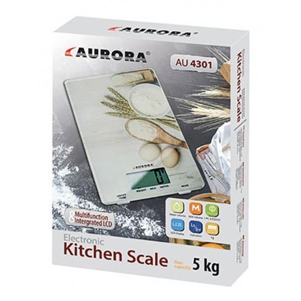 Ваги кухонні AURORA AU 4301 з максимальним навантаженням в 5 кг та кроком виміру 1 грам, оснащені плоскою скляною платформою. Модель має функцію вимірювання об'єму рідини, обнулення тари та вибір одиниць виміру.